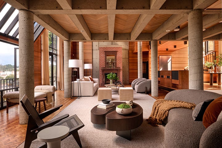 The home offers up an array of mid-century flourishes, including an open floor plan, floor-to-ceiling windows, as well as wood floors and ceilings that soften the rough concrete features. One particular highlight is the 2,000-square-foot lower level basement with a bar and fireplace. A well-placed dining room sits on a mezzanine level that looks both out the window and over the living room, which features soaring 20-feet ceilings.